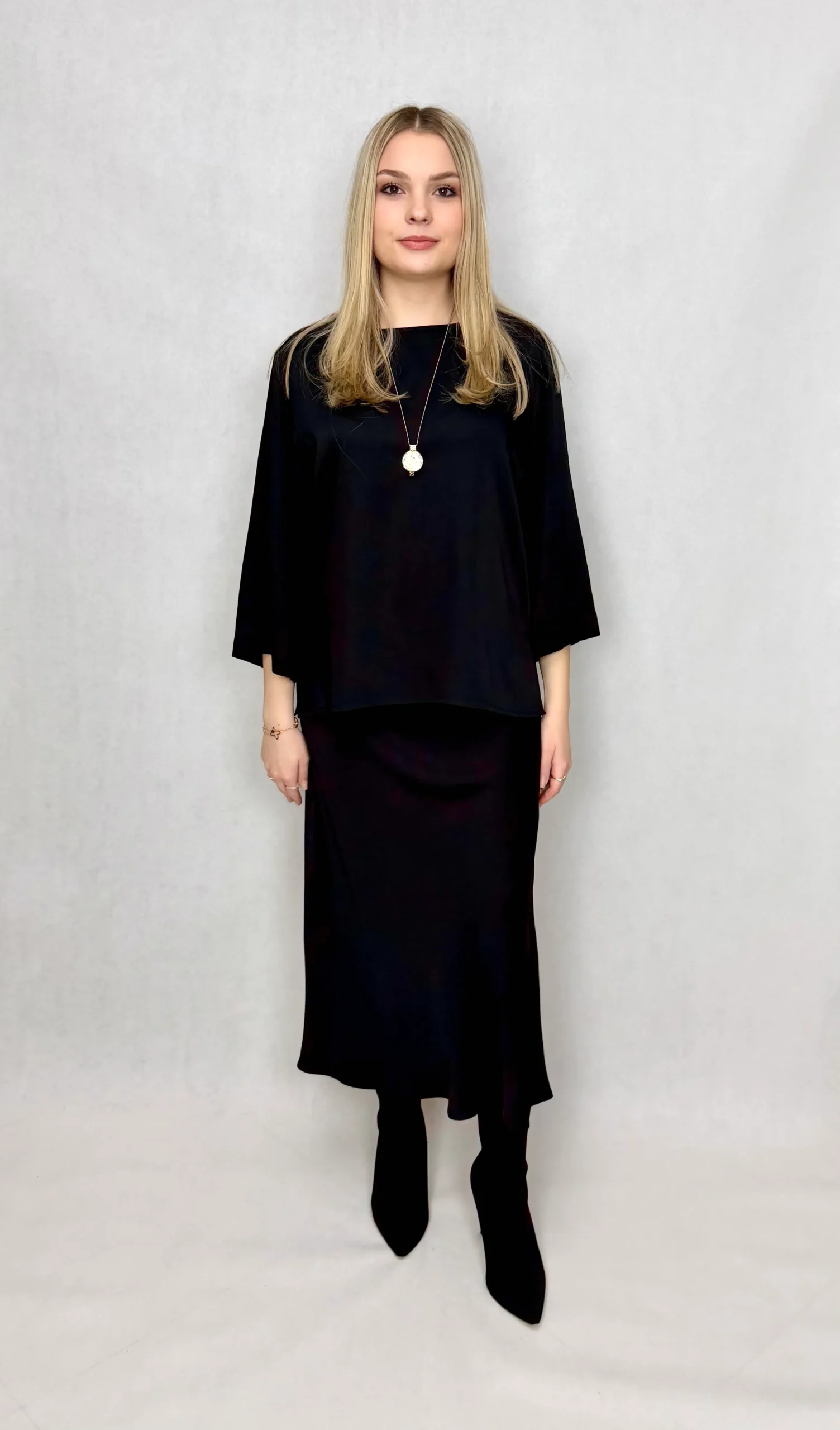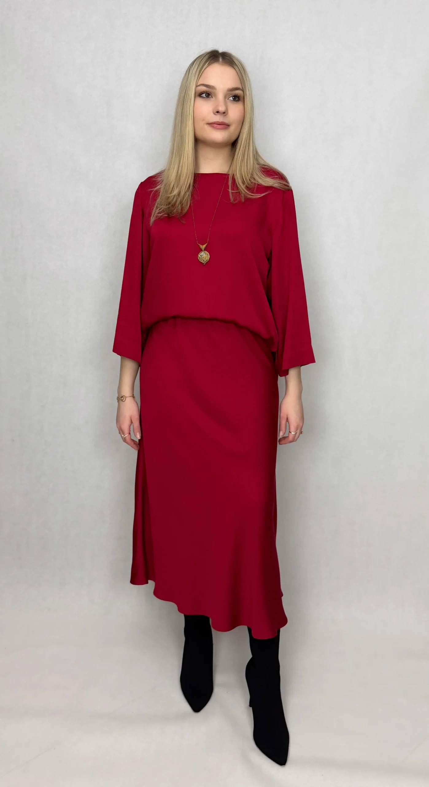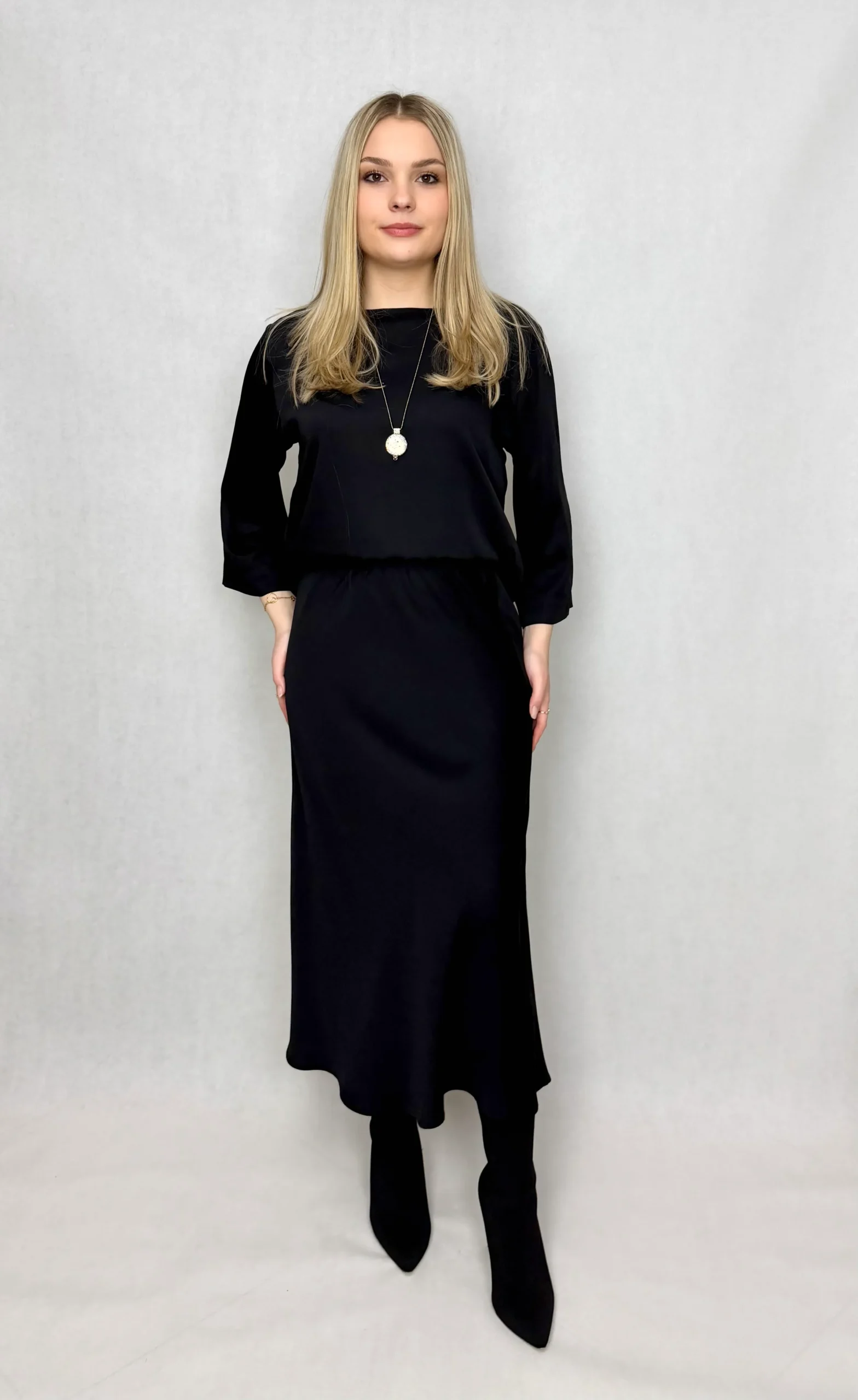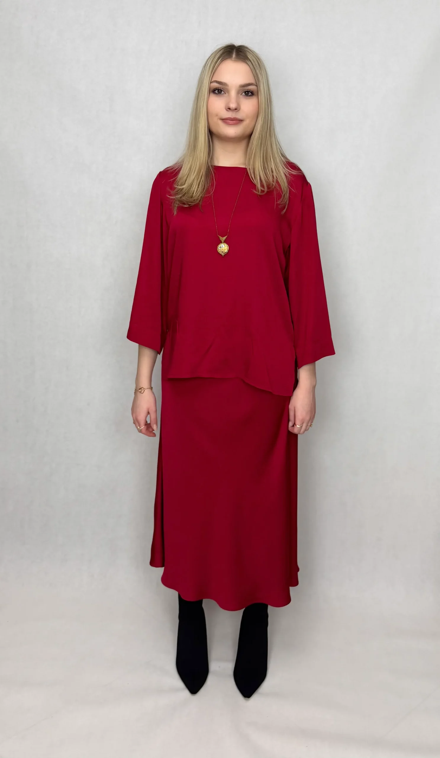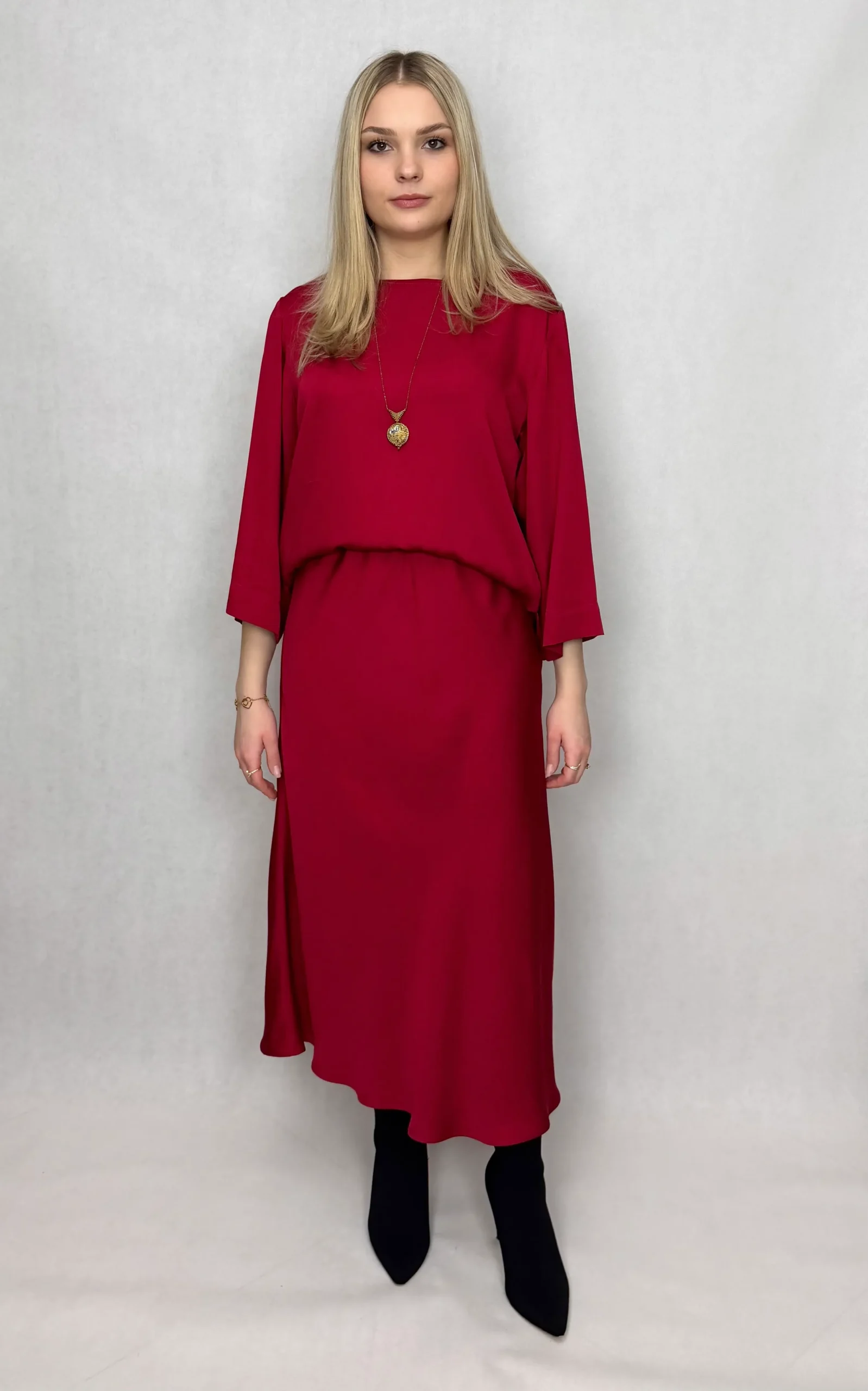 Odkryj komplet, który łączy w sobie to, co najlepsze: naturalną miękkość i oddychalność z eleganckim, gładkim wykończeniem. Ten zestaw – bluzka i spódnica – został stworzony z myślą o kobietach, które cenią sobie luksusowy wygląd bez rezygnacji z całodziennego komfortu.
