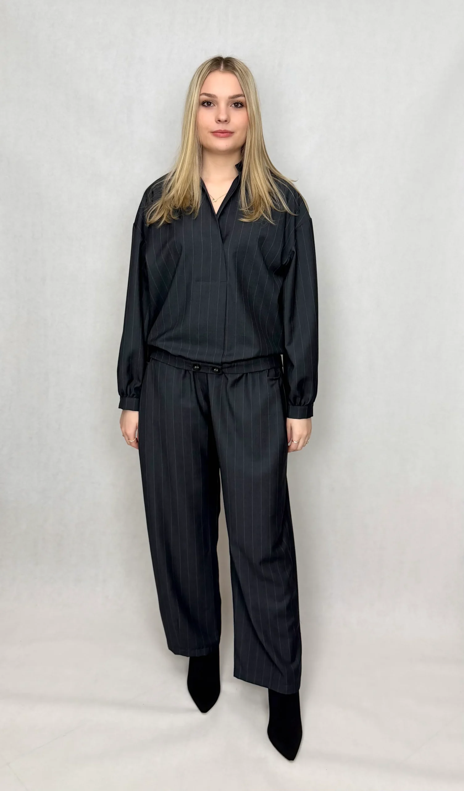 Odkryj zestaw, który jest elegancją samą w sobie – gotowy look, który emanuje dyskretnym luksusem i ponadczasowym stylem. Ten komplet – koszula i spodnie – w kolorze grafitowym w subtelne linie został stworzony, by zachwycać.